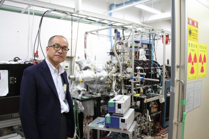 理学部第二部で20年以上教壇に立つ長嶋泰之学部長。研究室にて物理学の機械「ポジトロニウムビーム装置」を見せてくださった=東京都新宿区で、日本大・田野皓大撮影